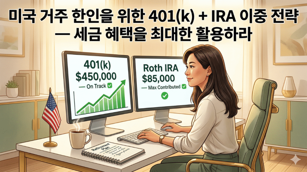 2025년 기준 401(k) 연간 기여 한도는 23,500달러(50세 이상은 추가 7,500달러 캐치업 기여 가능)입니다. 세전(Pre-tax) 기여로 처리되기 때문에 현재 소득세를 즉시 줄이는 효과도 있습니다. 한국 거주 당시 원화를 예금 금리 2~3%로 굴리던 분이 미국 취업 후 401(k)의 존재를 처음 알게 되면, 이 시스템이 얼마나 강력한 자산 증식 도구인지 실감하게 됩니다.