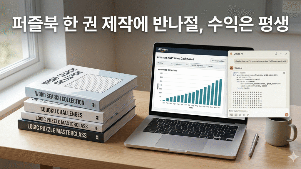수익 구조는 소설과 유사하지만, 장점이 있습니다. 퍼즐북은 일반적으로 소설보다 짧고(50~120페이지), 제작 속도가 빠르기 때문에 한 달에 여러 권을 출판할 수 있습니다. 아마존에서 페이퍼백으로도 출판하면(POD, Print-on-Demand 방식) 전자책보다 높은 단가로 판매되어 권당 $2~$4의 수익이 발생합니다. 시리즈로 50권을 쌓으면 매달 수십 권씩 팔리는 장기 패시브 인컴 엔진이 만들어집니다. 한국 거주 파이어족이라면 달러로 들어오는 로열티 수입을 미국 주식 ETF에 재투자하는 방식으로 복리 효과를 극대화할 수 있습니다.—