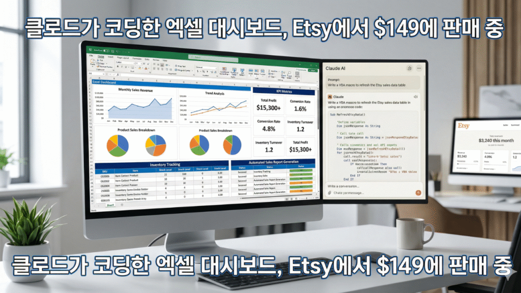 더 나아가 클로드에게 VBA 매크로 작성을 요청하면, 버튼 하나로 데이터를 자동 정리하거나 PDF 보고서를 생성하는 고급 기능을 추가할 수 있습니다. 이런 수준의 자동화가 가미된 대시보드는 Etsy에서 $49~$149에 판매해도 경쟁력이 있으며, 기업 클라이언트에게 직접 판매한다면 프로젝트 기준 $500~$2,000까지 받을 수 있습니다. 클로드로 구조를 설계하고, 본인이 최종 검수와 커스터마이징을 담당하는 역할 분담이 핵심입니다.