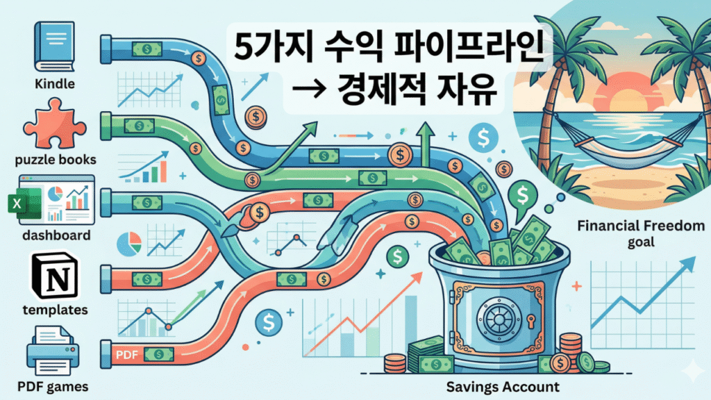 이 5가지 시스템은 서로 배타적이지 않습니다. 실제로 많은 파이어족들은 처음에는 가장 쉬운 시스템(⑤ 프린터블 PDF 또는 ② 퍼즐북)으로 시작해서 수익과 자신감을 쌓은 후, 단가가 높은 시스템(③ 엑셀 대시보드 또는 ④ 노션 템플릿)으로 확장해 나갑니다. 궁극적으로는 여러 수익 스트림이 병렬로 작동하는 포트폴리오를 구축하는 것이 목표입니다.