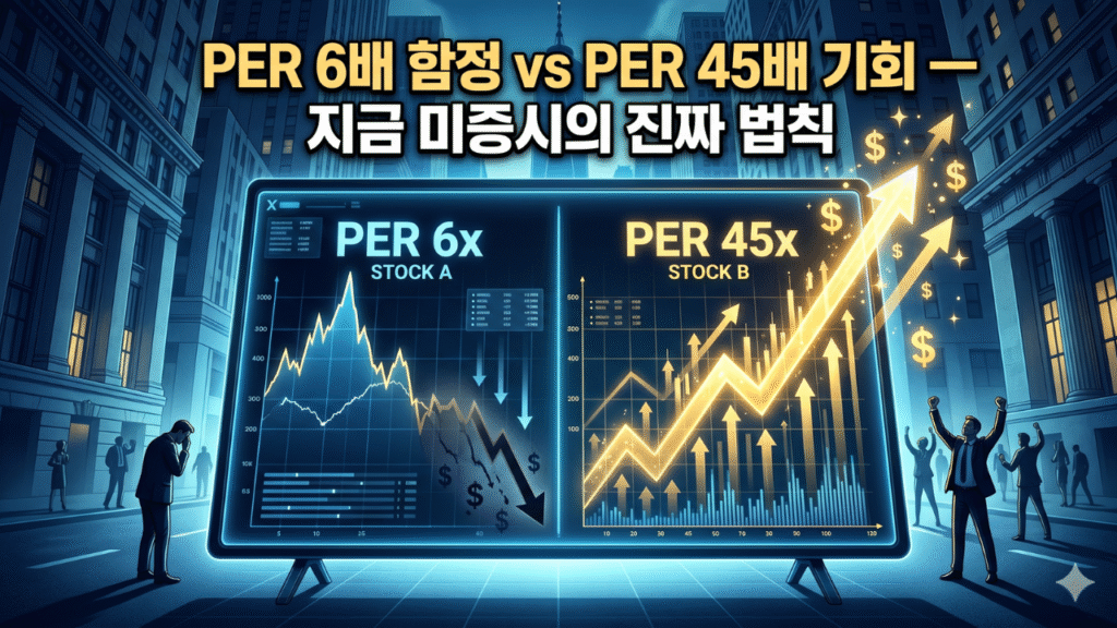 주식 투자를 조금이라도 배운 사람이라면 PER(주가수익비율)이 낮을수록 싸고, 높을수록 비싸다는 공식을 금과옥조처럼 여긴다. PER 6배짜리 주식을 담으면 “가치투자의 고수”라는 칭찬을 듣고, PER 45배짜리를 매수하면 “묻지마 투자자” 취급을 받는다. 그런데 지금 미국 주식 시장은 이 오래된 상식을 무자비하게 응징하고 있다.