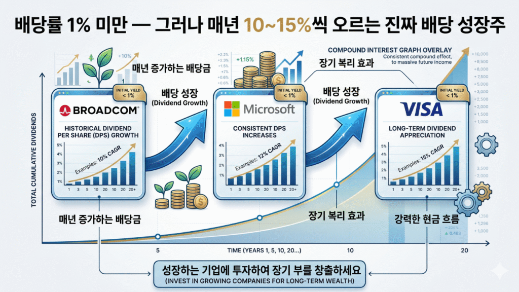 브로드컴·마이크로소프트·비자처럼 배당률은 낮지만 매년 10~15% 배당을 올려주는 기업에 일찍 투자한 투자자는 초기 투자금 대비 이미 고배당을 받고 있다.