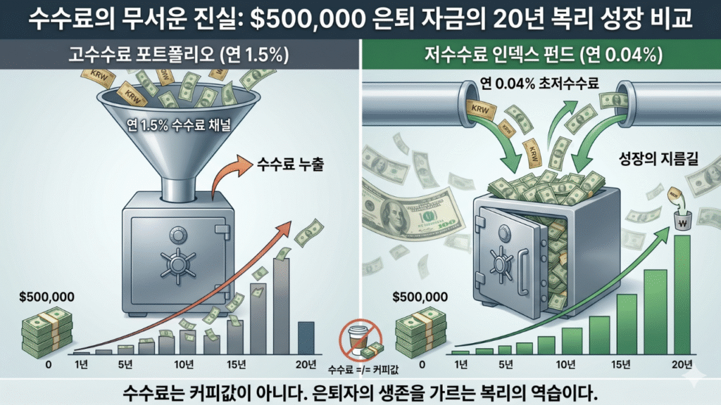 65세에 은퇴 자금 50만 달러(약 6억 8천만 원, 2026년 4월 기준 환율 1,360원 가정)를 투자한다고 가정해봅시다. 연 1.5% 수수료를 떼는 액티브 펀드에 맡기면 첫 해에만 7,500달러(약 1,020만 원)가 증발합니다. 반면 뱅가드 인덱스 펀드(수수료 0.04%)는 연 200달러입니다. 차이는 7,300달러.