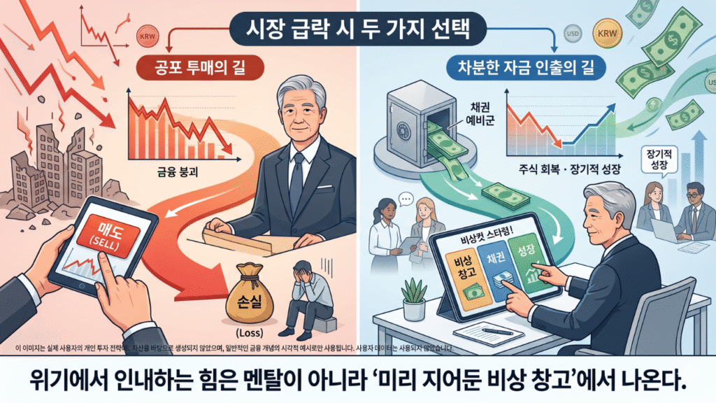 - “S&P 500이 고점 대비 -15% 이상 빠지면 주식 인출 중단, 채권/웰슬리에서 인출” 같은 구체적 규칙을 종이에 써서 냉장고에 붙여두세요. 위기가 오면 감정이 판단을 지배합니다. 미리 써둔 규칙이 유일한 방어선입니다.