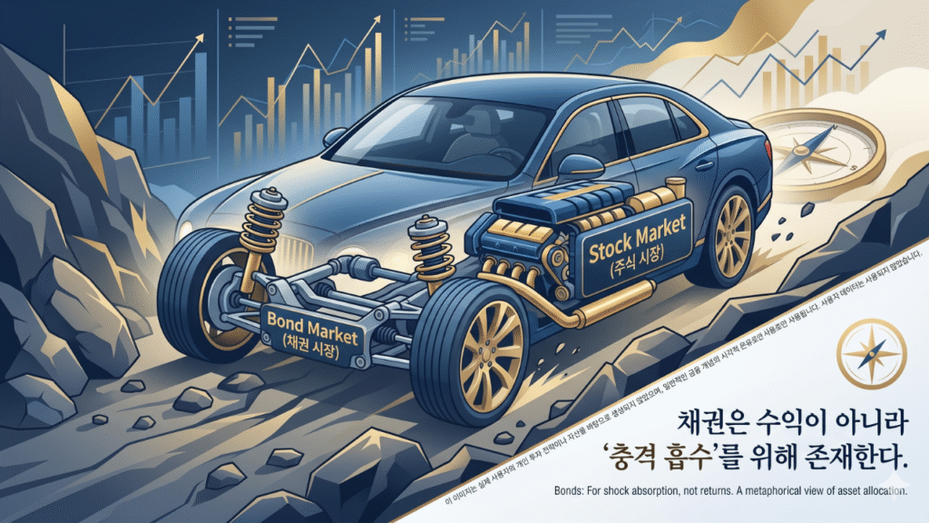 채권은 큰돈을 벌려고 사는 게 아닙니다. 주식시장이 패닉에 빠졌을 때 포트폴리오 전체가 무너지는 걸 막는 방어막이자, 투자자가 공포에 질려 주식을 싸게 팔아버리는 치명적 실수를 막는 심리적 안전판입니다.