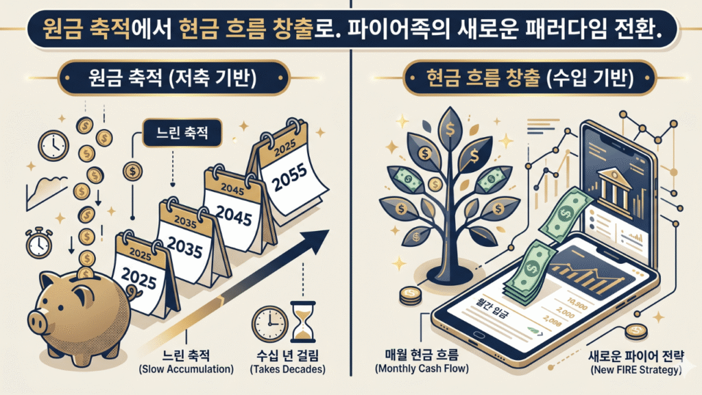 여기서 파이어족들이 주목하기 시작한 것이 바로 “원금 축적”에서 “현금 흐름 창출”로의 패러다임 전환입니다. 굳이 12억을 모으지 않더라도, 매월 500~600만 원이 들어오는 시스템을 구축하면 경제적 자유는 당장 내일부터 시작될 수 있습니다. 핵심은 ‘자산의 크기’가 아니라 ‘자산이 만들어내는 현금의 속도’라는 관점의 대전환이죠.