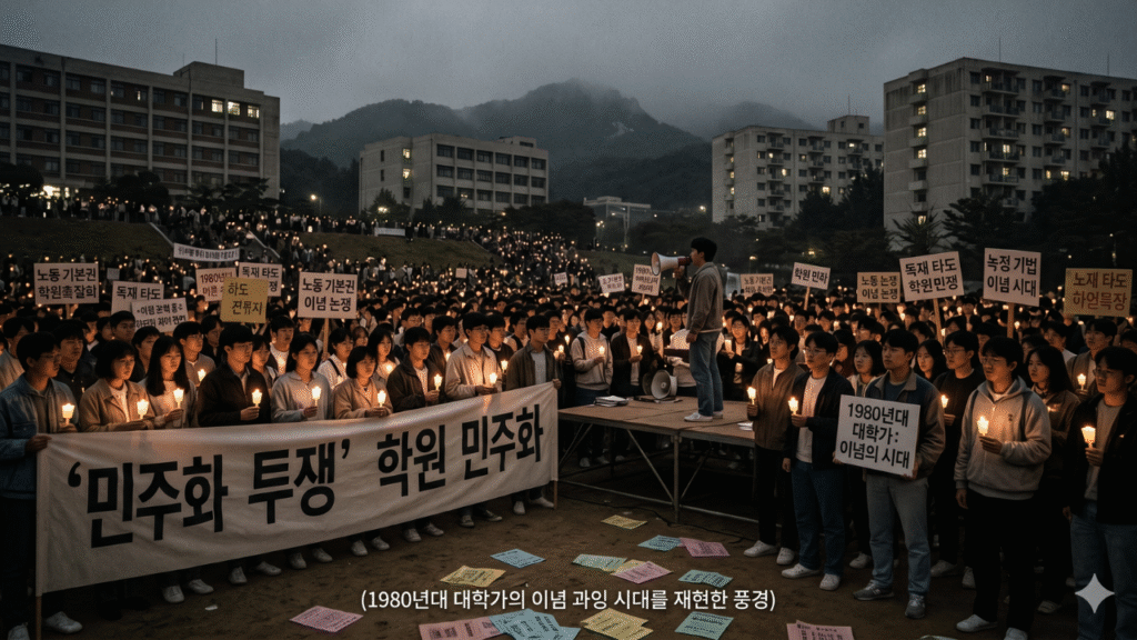 - 1980-90년대 대학가에서 주사파(NL)와 민중민주(PD) 세력이 양분한 좌익 이념 과잉 현상이, 김대중 시대 이후 제도권·언론·학계로 확산되며 오늘날 대한민국 사상 지형의 뿌리가 되었다.