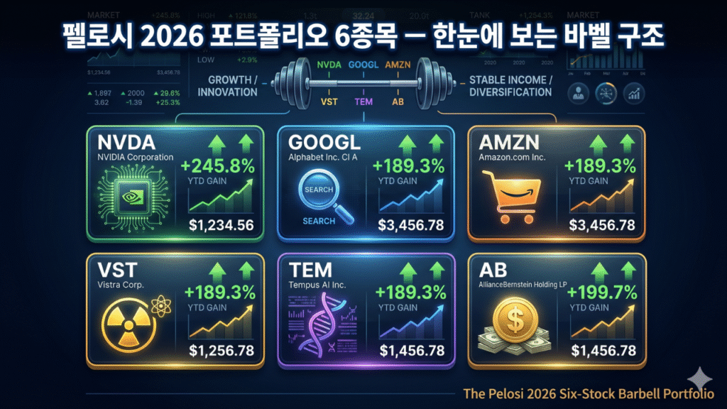 - 포트폴리오 구조는 전형적인 바벨 전략(Barbell Strategy): 한쪽은 AI 혁신 레버리지(NVDA·GOOGL·AMZN·TEM), 반대쪽은 초고배당 방어주(AB).